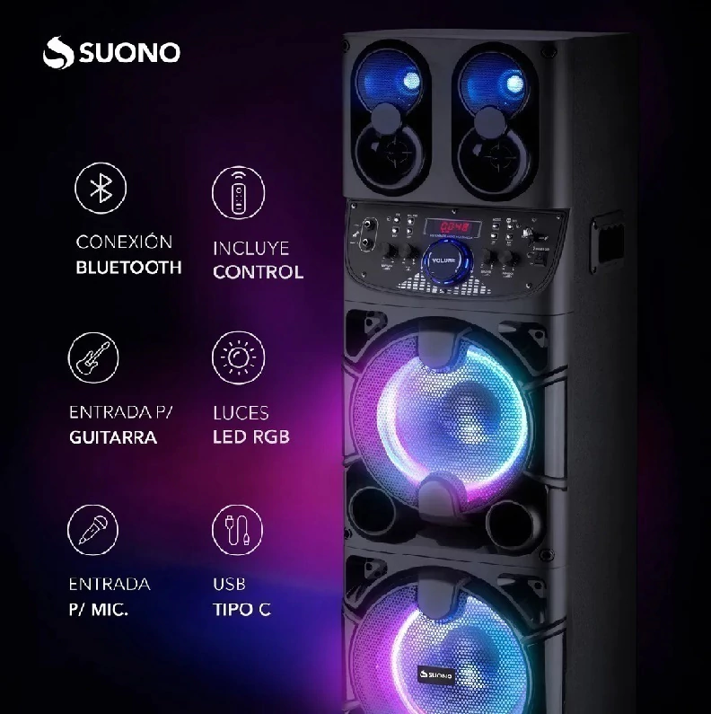Experimentá un sonido potente y envolvente con la Torre de Sonido Suono, diseñada para quienes buscan calidad profesional, estilo moderno y versatilidad en un solo equipo.